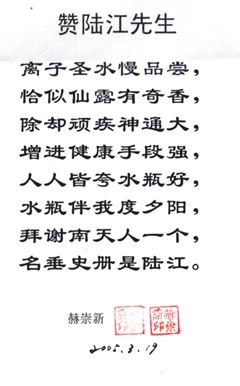 3. 詳細(xì)了解請上網(wǎng),可見臨床報告,鑒定證書、專家評說、治病機理、用戶反饋、題詞、詩歌、錦旗等彩色掃描件,被譽為"神奇水瓶"。