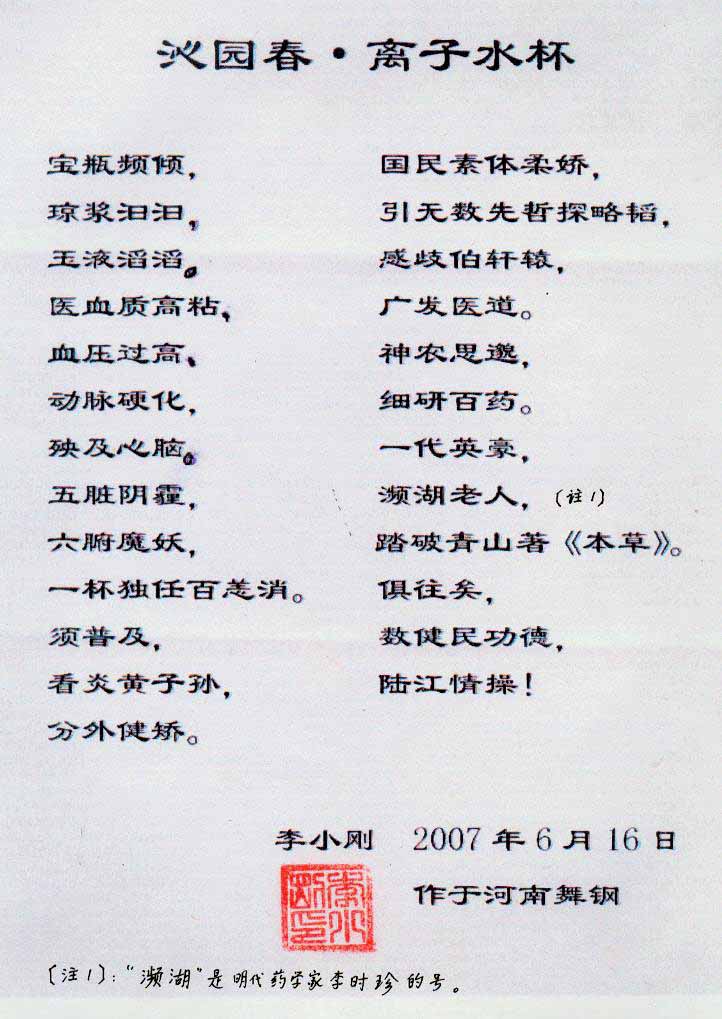 -----我是從事建筑的高工,本來沒有資格去攻克醫(yī)學(xué)難題,卻為了自身健康才扣響醫(yī)學(xué)的大門。由于我1990年患高血壓,因怕中風(fēng)才研究發(fā)明了離子水瓶,我把水處理成微小分子團水,飲用后治愈了高血壓。便于1993年底送到三家省級醫(yī)院做臨床試用4個月。經(jīng)北京和廣西醫(yī)學(xué)專家鑒定:"降脂降壓效果好"," 能擴大心腦動脈流量,改善心腦電圖以及微循環(huán)","對治療心腦動脈粥樣硬化、高血壓、高血脂有良好的醫(yī)療保健作用。""產(chǎn)品的技術(shù)性能和療效達到了同類產(chǎn)品的國內(nèi)領(lǐng)先水平,經(jīng)廣西醫(yī)學(xué)科學(xué)情報研究所檢索,未見國外有類似報道。"中國醫(yī)學(xué)科學(xué)院張正國教授從美國國立醫(yī)學(xué)圖書館數(shù)據(jù)庫存Medline檢索英俄文資料,均未見類似報告。2000年上市后,我為了對消費者負(fù)責(zé)而繼續(xù)觀察研究,一直通過《信譽卡》和《質(zhì)量跟蹤調(diào)查書》向患者承諾療效,請用戶使用6個月后反饋效果。和脂壓患者飲用2至5個月內(nèi),消除癥狀,停服藥物,血壓正常;冠心病患者飲用3~5個月逐漸減輕至消除心絞痛、房顫等癥狀,不再服藥,飲用1年左右心電圖正常,經(jīng)冠脈造影掃描無明顯狹窄,表明冠心病痊愈。大量患者還反映許多衰弱器官被修復(fù),讓前列腺增生、慢性咽喉炎、慢性氣管炎、支氣管炎、慢性胃炎、腸炎和膽囊炎等不藥而愈;2型糖尿病患者是因為胰島衰弱致病,飲用該水半年至一年,逐漸減藥至停藥,血糖尿糖正常,真正治愈2型糖尿病。中風(fēng)后遺癥患者飲用六七個月,可逐漸減輕至消除肢體和語言障礙,表明飲用該水能讓壽命很長的神經(jīng)元細(xì)胞逐漸修復(fù),奇跡般地恢復(fù)肢體和語言功能。飲用后還使胸腺和脾臟兩個重要的免疫器官被修復(fù)和增強,產(chǎn)生免疫細(xì)胞多,提高了免疫力,使人不生病或少生病。自此, 飲用微小分子團水創(chuàng)造了攻克冠心病、高(低)血壓和糖尿病三大醫(yī)學(xué)難題的奇跡。人們對此感到不可思議,但實踐是檢驗真理的唯一標(biāo)準(zhǔn)。